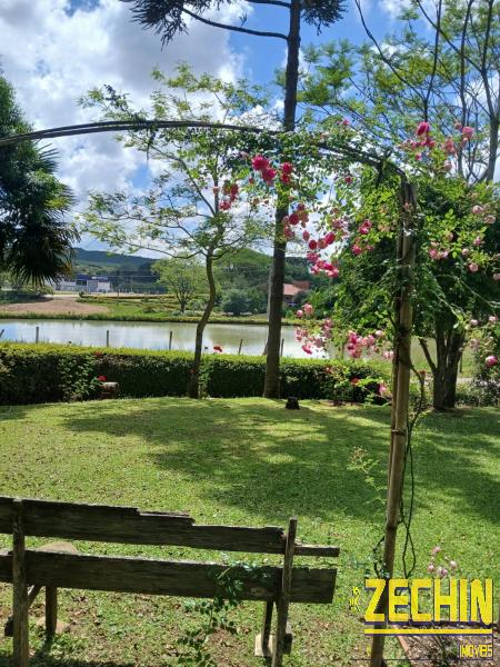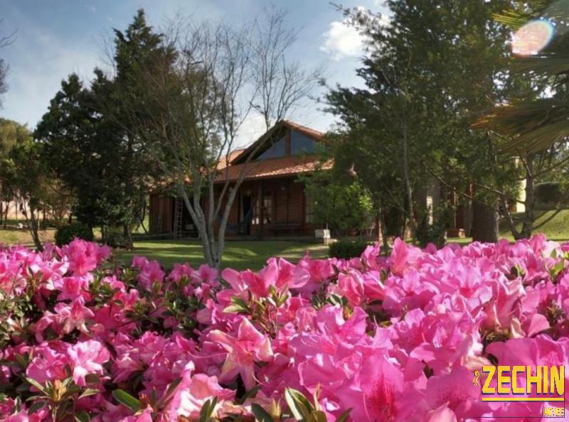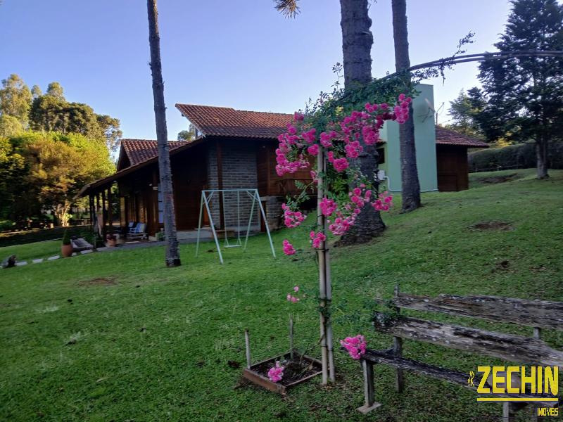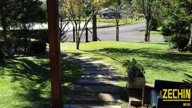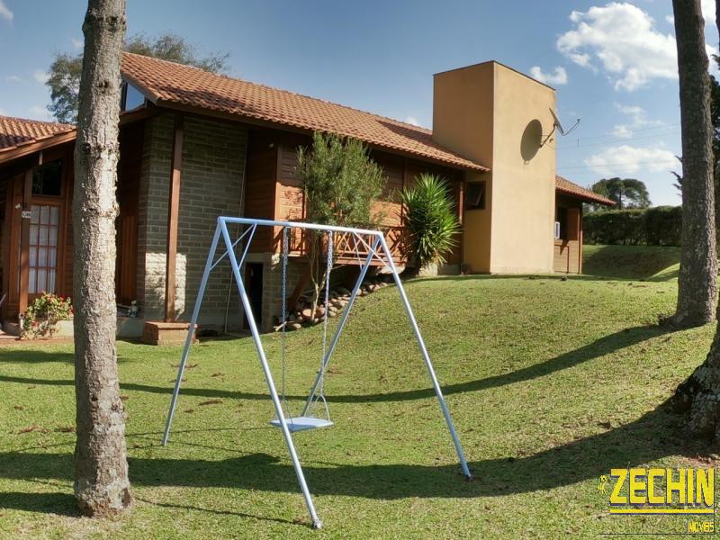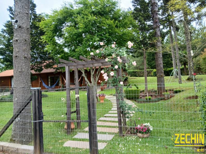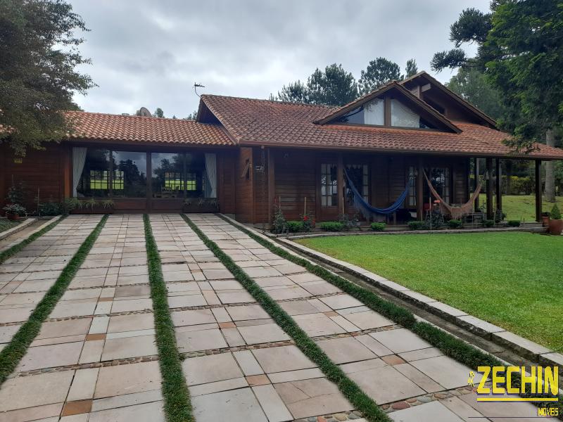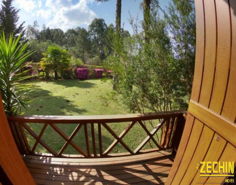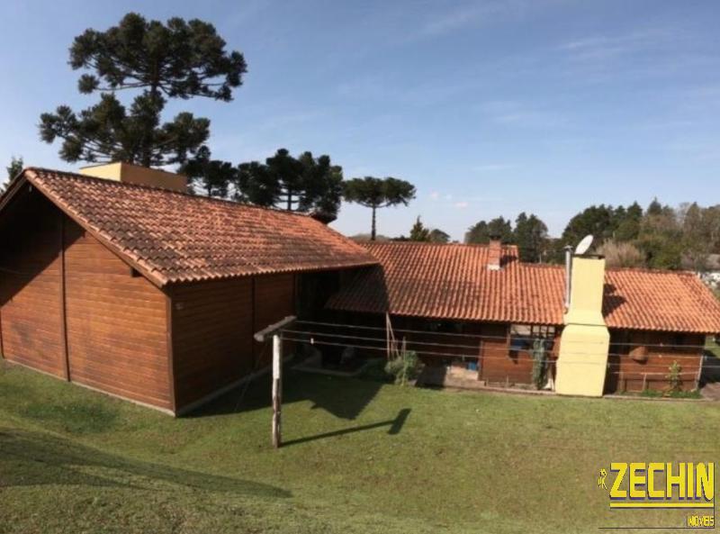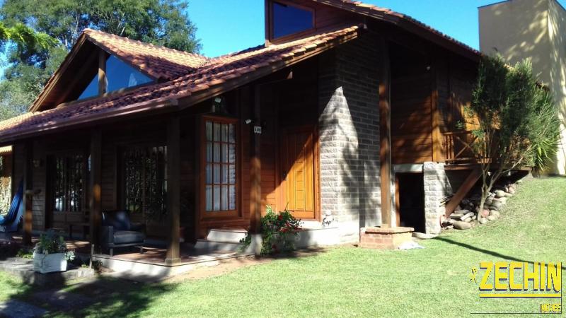 Casa medindo 320 m², erguida em madeira de lei com paredes duplas, tijolos e pedras, dividida em 3 dormitórios sendo um suíte e closet, sala de estar, cozinha, banheiros, lavabo, área de serviço, garagem para dois carros e varanda.